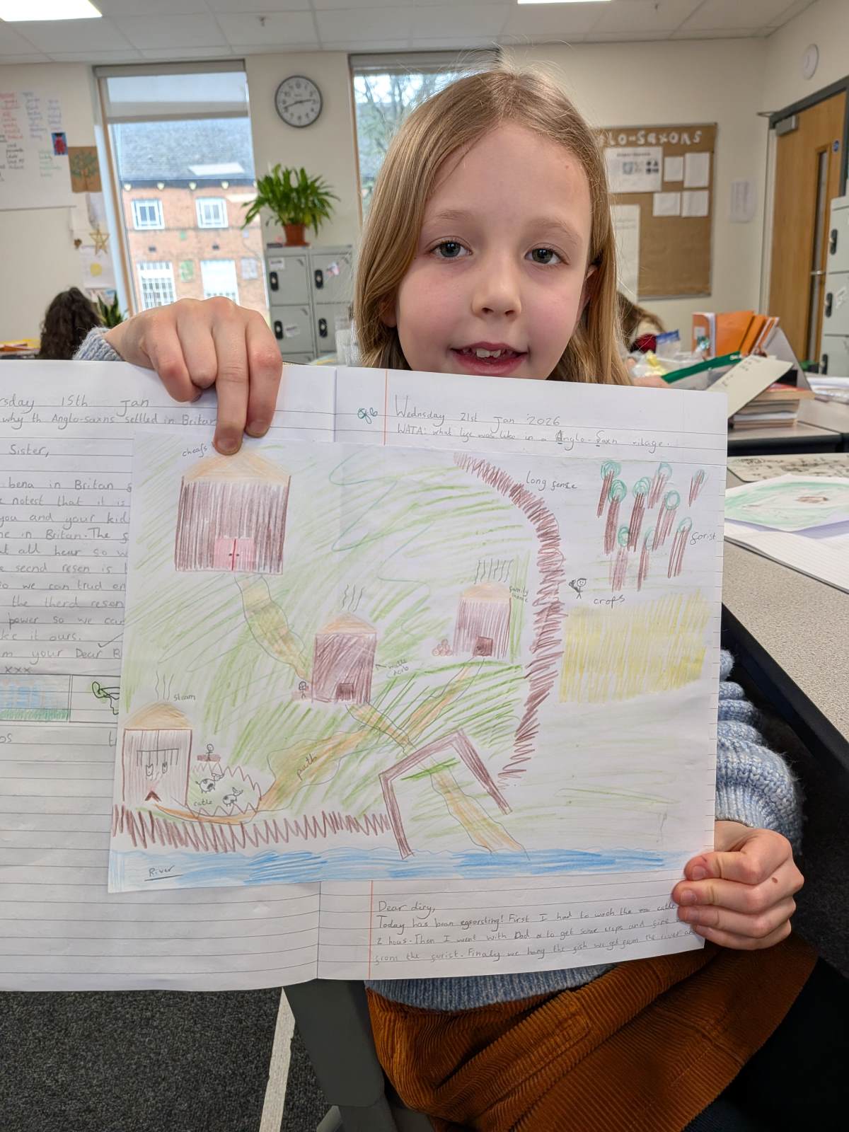 "What was it like to live in an Anglo-Saxon village?" This is what Lime class learnt about in history today. We learnt that it was hard work, with endless jobs to complete, such as chopping wood, making tools, keeping the fire going, keeping an eye on livestock from wild wolves, weaving... we drew maps of Anglo-Saxon villages and wrote diary entries as Anglo-Saxon children. Amazing work Lime class!